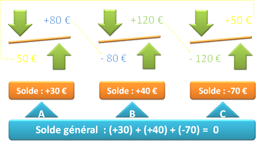 Le membre C vend pour 50 € et achète pour 120 € soit un solde de -70 €