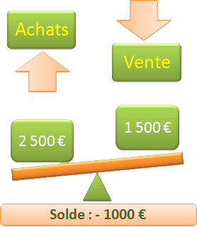 Ce membre souhaite ensuite acheter une nouvelle voiture au prix de 2 500 €. Il demande une autorisation de découvert de la différence soit 1 000 € et devient l'heureux propriétaire de sa voiture. La fin du mois arrive, le schéma de droite nous montre le solde des opérations.